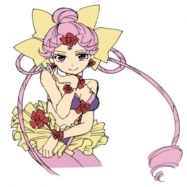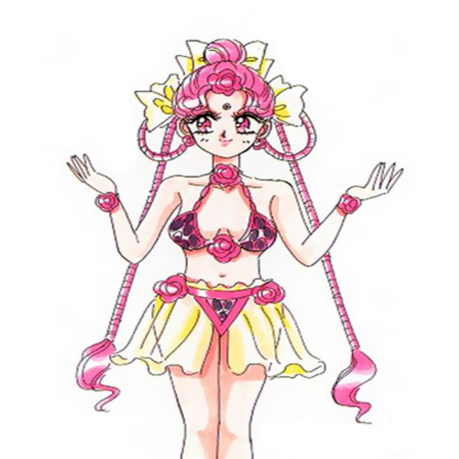 This is a photo of CereCere, a fictional character who is the leader of the Amazoness Quartet in Sailor Moon. CereCere has long light pink hair, styled in two long outward braids, two braids tied in a circle on the sides of the head and pulled up right on the top of the head. She has dark red eyes and a dark purple gem in the center of her forehead.