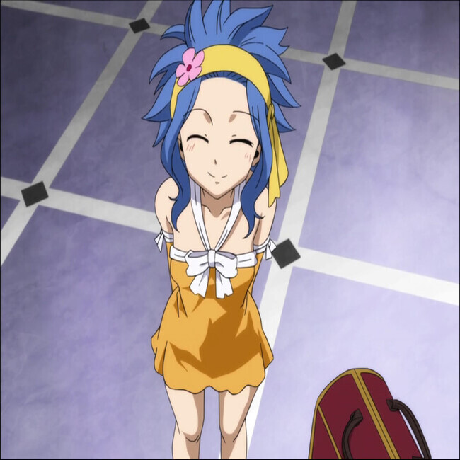 Levy Macgarden is a slender young woman with a shorter height for her age. Her hair is shoulder-length navy blue, with bangs usually tied up with a ribbon around her head.